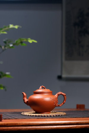 凌锡苟《报春》报春为传统壶式,此壶采原矿朱泥制作而成,以梅作装饰。壶身呈鸡心型,高颈箍以母子线相吻合。流、把皆以梅枝为形,树皮的皲裂、瘿瘤感刻画得逼真而细腻……