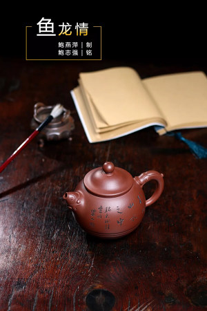 周志君曾在介绍夫妻二人代表作时讲过,《鱼龙情》紫砂壶,在夫妻二人合作的作品中十分具有影响力,壶身饱满挺秀,壶体下半部饰以两道简洁的勒线衬托出水波的韵味,壶嘴为鱼形……