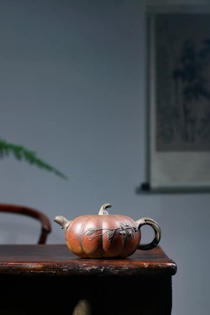 张正中《全手南瓜壶》青枝蔓蔓叶滴翠,黄金灿灿玉雕琢;南瓜,紫砂花器中是经典的器型之一,历代紫砂大家创作出无数佳作,小小的一只南瓜,经巧手制成,便也有了不同的风格与神韵……