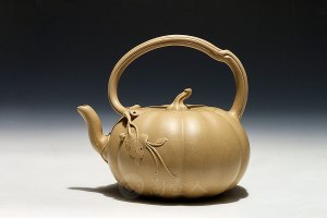 高湘君,江苏省工艺美术大师(2016年 第六届),江苏省陶瓷艺术大师(2016年 第二届),正高级工艺美术师,师承李碧芳、谢曼伦。在古代,葫芦是仙佛故事中与神仙和英雄相伴的宝器。在民间,葫芦是福禄双全的象征,也是镇宅安家之物。“葫芦壶”为曼生壶壶式的中的一款,以仿生葫芦为题材。《五头葫芦茶具》由一壶、二杯、二杯托组成,趣味自然,命名“葫芦壶”,可谓是名副其实。从整器的外形来看,壶身和壶盖共同勾勒出了葫芦的形状,形象逼真。饱满鼓腹,