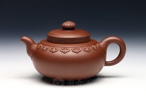 黄云芸,国家级工艺美术师,吴云根高徒葛明仙爱女。云肩如意壶最初为顾景舟大师创作,此壶由黄云芸老师制作完成。运用原矿底槽清,砂质细润。整壶形制类鬲式炉,取材自青铜三足鬲式炉,壶身扁圆,气韵充沛。壶流呈以三弯流做吞吐状,自壶身一侧刻划出流畅的如意筋纹,精雕细琢,气势非凡。壶口与盖圈刻仿古图形,壶钮呈莲花含苞欲放状。壶把以环形流畅造型末梢收于壶身,下有三只鬲钉足。壶底由弧度优美的三足托起整个壶身,似三朵飘逸的祥云,使整把壶氤氲沉浸在一种温馨、祥和、安