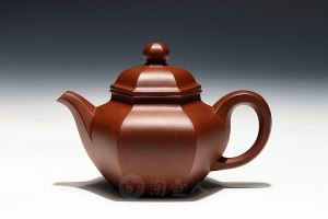 周定华,实力派陶艺家,师从顾绍培、周尊严,擅长方器,人称“方器专家”。小六方由周定华老师制作,采用原矿底槽清,泥质呈深紫色,纯正紫润,壶身手感极佳。此壶是掇球壶的方形衍变,既有棱角,又不失圆润,棱线直爽而略曲,不失阳刚之气,构思巧妙而制工细,给人带来不一样的视觉感受。整壶以六方瓜瓣成型,上敛下展,简单中求变化,上下一气贯通。耳形把亦呈方形,与壶身一致,壶钮方圆相济,如同莲子安于壶身。自壶钮至壶底均为六方体,六条曲线上