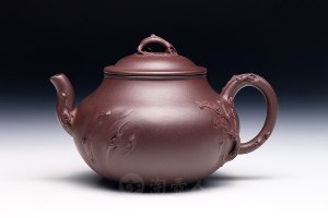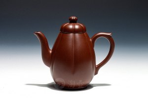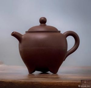 在王寅春所有作品中,有一件孤品就是“高瓜”,瓜型本不起眼,但是在王老师的迁想妙得下,却成就了一款经典之作。佳作自然被追崇,《高瓜壶》是高湘君老师2000年的作品,此壶选取原一厂老紫泥,摹古王寅春老艺人制成,容量为240CC。泥色深沉朴茂,泥料砂质古朴,老泥料经过多年自然润养,紫玉韵光,别具韵味,深受藏家追捧与喜爱。此壶以“瓜”为造型,体型硕大,长弯流、耳状把,筋纹壶钮、壶盖与壶身相呼应。线条衔接自然,上下气韵贯通。此壶身如梨形,口小肚大