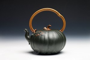 绵绵瓜瓞,民之初生有子孙兴旺,延绵不绝之意段泥作胎,粉浆饰之藤为黄金段,色彩古老神秘壶体南瓜型,翠绿饱满壶身筋纹明理清晰,做工精细蜗牛行与南瓜蒂钮之上瓜叶卷裹成流瓜藤金黄苍老,弯成提梁瓜瓞连藤叶,脉络形象逼真花货与筋纹器兼形成型极难薄胎工艺更是难上加难花货筋纹少见刻绘