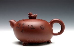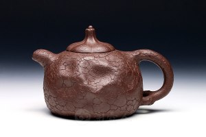 姚志源老师师承其母——花货大师汪寅仙,书法陶刻师承陶刻大师谭泉海,可谓家学渊源,将门虎子。姚志源老师作品以光货入手,后在母亲汪寅仙大师的教泽下擅长花货及雕塑器。其花货作品独树一帜,光货作品也是可圈可点。姚志源老师这把《煮水壶》,采用泥料为原矿紫泥制作而成,壶容量为840cc,此壶端庄沉稳,气韵饱满充沛,壶身鼓腹,使壶身显得雍容大度,盖上圆珠钮与壶身对比鲜明,壶嘴二流,出水爽利,耳形壶把,拿握舒适。《煮水