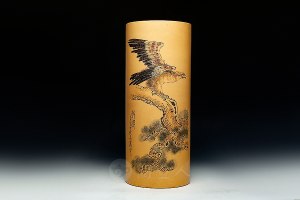 谭泉海,艺名“石泉”,中国工艺美术大师、研究员级高级工艺美术师,师承著名陶刻家任淦庭学艺,集文学、书法、绘画、金石、篆刻等艺术修养于一身。用“笔落惊风雨”来形容谭泉海大师的刻画风格甚是恰当。今天,我们就随着谭泉海大师的刻绘作品,来领略一下大师神妙的刀功。 《长空搏击陈设》是已故国大师谭泉海制作于2001年并陶刻装饰,该陈设上刻松鹰《致远图》与《咏鹰》诗句,诗文呼应,相得益彰,具有极强的收藏价值与观赏价值。此陈设,书画结合,颇有以