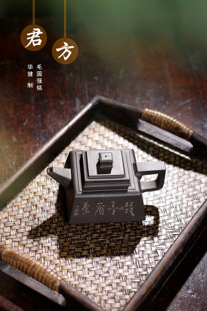 华健,男,1964年5月生于陶都,2012年研高,江苏省工艺美术大师(2016年 第六届)、江苏省陶瓷艺术大师(2011年 首届),宜兴市非物质文化遗产项目代表性传承人,1982年进宜兴紫砂厂,师承国大师顾绍培、省大师刘建平,从事紫砂工艺创新制作,善制各类紫砂器皿,尤擅长方器造型的设计制作,紫砂全手工制作技艺功底不凡,属同辈艺人佼佼者。《君方壶》是实力派省大师华健老师九十年代初期制作的作品,采用原矿青灰泥制作成型,泥色稳重,具有沉朴内敛的气韵。国大师毛国强镌刻装饰,更添收藏价值。