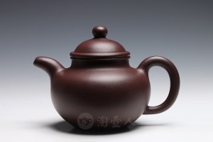 此壶为陈国良大师全手制作于1997年,运用薄胎工艺,造型看似沉稳,实则上手轻巧,印证了老子“大巧若拙”的道家理念。运用原矿老紫泥作胎,泥料珍贵,外如碧玉。取“松”为题,样式新颖;壶身极简,以本色肌理呈现紫泥古雅温润之美;壶纽、壶流及壶把以精细化的雕、贴、塑手法,刻画的古松枝桠、松针、松果栩栩如生;压盖造型与身合融,气密性佳;壶腹收于圈足,贯气雄壮