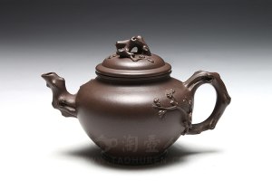 此壶以梅为形为意,传承朱可心(紫砂壶七大艺人之一)的“报春壶”风格。流、把、钮均以梅枝捏塑而成,节疤布局合理,突出了梅的风骨。壶身光洁圆挺,子母线契合紧密。足底与壶颈上下呼应,突出视觉美。
