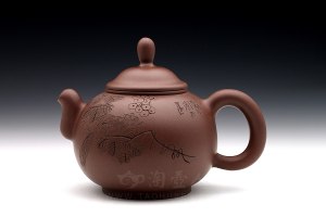 采用了原矿底槽清制作而成,壶容量为600cc,壶体敦厚古拙,高颈圆平盖,壶身为梯形,上小下大,线条逐渐过渡,外观却平整圆润,圈足美观,与壶颈上下对应,压盖子母线圆润饱满,壶盖平整似水面,壶钮为柱型,两圈纹理装饰,跟显小巧古朴,直嘴长而有力,粗细过渡均匀,环形把大气美观,自然向上翘起。谭泉海大师书画装饰,壶体正面陶刻“清香浓韵”,“泉海书”,壶身反面刻绘荷花图精美动人,清雅荷花,香气四溢,底款印章『谭晓君制陶』,此壶造型别致,刻绘精妙,是一款品茗的佳作。