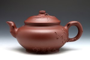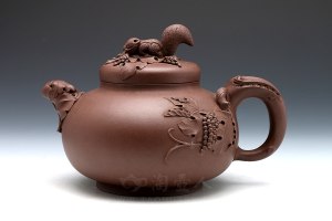 范建荣,2012年高工、省名人,1986年进紫砂工艺厂,师承中国陶瓷艺术大师、江苏省工艺美术大师季益顺。现为“益顺陶艺中心”主创人员,季益顺壶艺流派的优秀传人。06年被称为“紫砂十二精英之一”,采用了原矿紫泥制作而成,壶容量为360cc,整器饱满,壶盖处葡萄藤装饰,松鼠为壶钮,悠闲自得似乎在觅食,活泼可爱,葡萄藤叶包裹着壶嘴,一弯流胥出,葡萄藤作为壶把装饰,形态优美,用它喝茶也是一种享受了,周时让人感觉此壶充满大自然的气息。