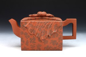 孔小明,男,1962年出生于制陶世家,2014年高工。1992年进厂,受到潘持平老师指点和吕尧臣老师作品风格影响,1990年与兄弟孔春华、姐姐孔新华推出了“孔家壶”紫砂艺术品牌,紫砂绞泥技法,出神入化,目前宜兴可达此境界者,屈指可数。在方器的制作和创新上,“孔家壶”被行业是公认的实力派。采用了原矿底槽清制作而成,壶容量为370cc,此壶壶体呈方形,截嵌盖与壶身的垂直三角布纹褶皱合为一体,以绸布结作壶钮,三弯嘴,方执把,平假底,形制奇巧,线条流畅。