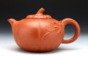 扁南瓜,380cc,南瓜壶是紫砂壶中很常见的一种款型。但是此南瓜不仅外形酷似南瓜,更是集聚了南瓜的神韵,犹若瓜熟即将待落。壶钮、壶把皆以南瓜藤为原型,形象逼真。壶嘴则若南瓜叶包裹而成,精巧别致,创意极新。壶把处一南瓜叶子胥出,苍老却不失神气。而南瓜壶身,红色斑驳,极似熟透了的南瓜,让人有快速采摘的冲动。 底款印章『志源』,此壶仿于自然却又高于自然,着实清新美妙,趣味动人,以此壶品茗,可以感受到无穷的田园趣味。