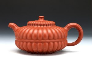 此壶采用了原矿朱泥制作而成,壶容量为240cc,合菊壶式以仰菊与覆菊上下相合而成,有谓“上下印封,身盖齐同,分割精准,纹理清晰,深浅自如”,正是筋纹器结构形式的具体呈现。此壶圆鼓身腹,筋纹上下对称,交错相映,通体呈曲线之美,令人赏心悦目。口盖瓣片相吻合,壶盖上置一壶钮,其形似若壶体缩影。壶流弯式,圈把浑圆昂扬,全器比例恰当,造型典雅。