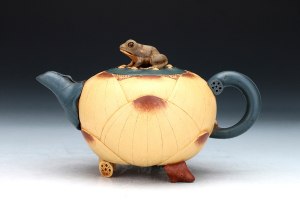 此壶采用了原矿段泥制作而成,壶容量为180cc,荷花常常是艺术创作的重要题材之一,因“荷”通“和”,有祥和之意。此壶以一朵含苞欲放的荷花作壶身,卷裹的荷叶为壶嘴,以枝梗挽成壶把,以荷花莲蓬作壶盖,壶盖上一只栩栩如生、活灵活现的青蛙为钮,壶底塑三足,分别为荸荠、菱角、莲藕,将江南水乡特产融于一壶之上,更添吉祥美意,整个整个作品造型,比例协调、匀称,线条流畅、优美,体现了浓烈的生活情趣,是大自然造化的艺术反应。