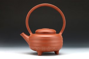 徐达明(1952—2016),2008年研高,江苏省工艺美术大师,中国陶瓷艺术大师。宜兴紫砂陶艺世家徐门第四代传人,中国工艺美术大师徐汉棠的长子。设计创新运用红木等材质与紫砂相结合,表现紫砂新语言。该壶选用原矿紫泥全手工制成,壶身鼓腹,饱满充沛;壶肩平稳过渡,高壶颈、压盖与壶口吻合严密,无钮设计更显敦厚朴质;底部圈足衬托出高挑的壶身,更显立体效果;直嘴斜出,出水流畅,壶把设计新颖,如同古代风箱的拉手,并镶以象牙装饰,将技艺发挥到精致!