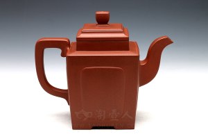 此壶采用了原矿青灰泥制作而成,壶容量为280cc,壶身呈三角形,形态雅致,舒展挺拔,端庄稳重,柔中带刚;线条饱满,壶底部与壶腹部乃是小弧面围绕而成,连成较为圆滑的圆锥体;壶嘴较为修长,直挺胥出,挺括有力,出水冲劲十足;暗接三角形端把刚毅有力,尖端转折圆润,十分称手;壶底三足圆润精巧,稳重鼎立;壶钮为散开的三角形大钮,圆弧感明显,与盖的交接处似明似暗,功力老道。