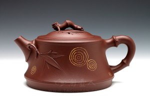 《竹韵》壶是820cc大品,雅量非常,研高钱丽媛老师全手工製壶,底槽清泥质清润,与“竹”元素搭配更显大方爽利,骨节分明。 壶体为一截竹筒,线条爽利,嵌盖鼓出,气韵饱满。流把钮竹节塑成,曲直有度,贴塑竹枝竹叶立体生动,清雅萧瑟之气顿出。壶体泥绘螺纹,生命年轮增添沧桑之意!