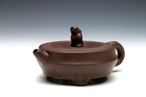 吕尧臣老师这把《金蟾玉壁》壶,采用了原矿紫泥制作而成,壶容量为180cc,金蟾玉璧壶,原矿紫泥制成,壶体呈扁圆形,上部琢谷文玉璧为饰,古朴庄重,典雅大方。
