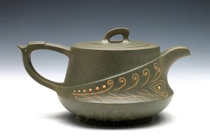 此壶采用了原矿本山青段泥制作而成,420cc,圆润的造型,饱满的壶身,密实而协调的嵌盖将圆润的壶身圆满意味衬托得淋漓尽致,耳把曲线优美,收放有度。弯流将弧线的柔美演绎到极点,双排孔既出水爽利,又可断水自如。 壶身周围镶金,盖款『范』,『泽锋』,底款印章『泽锋制壶』,此壶不论是造型色彩还是壶所寄寓情趣和理念,皆值得玩味,该壶值得珍藏。