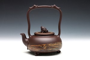 顾道荣,2012年研高,江苏省陶瓷艺术大师,先后师从七大老艺人之朱可心、顾景舟、蒋蓉,这把《祝寿壶》,1060cc ,将竹段、桃枝、桃叶、猴子、寿桃等元素融为一体,以寿桃为题,凸出中华民俗中福禄寿文化,值得细细品味。