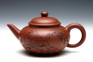 张红华, 2005年研高,江苏省大师、省名人;师承著名艺人王寅春、紫砂泰斗顾景舟,得顾景舟大师长期悉心指导,此壶是 韩敏陶刻, 正面陶刻了竹叶下的居士,反面刻绘“卧云歌德,对雨著“茶经”,不可多得的精品壶!