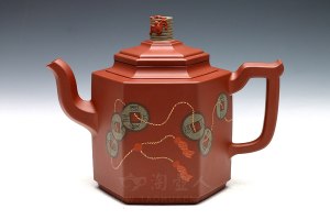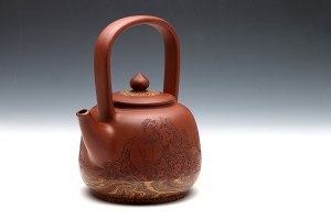 孔春华,2012年国工,当代紫砂名家,1959年出生于江苏省宜兴陶艺世家,1992年调进紫砂工艺厂研究所从事创新设计,1990年与姐弟推出“孔家壶”品牌,2005年入编《世界名人录》。这款六方壶工整大气,装饰华贵美好,具有鲜明的孔家壶特色。采用了原矿底槽清制作而成,壶容量为440cc,壶身自然为六方圆柱体,切面工整,线条挺拔硬朗。从壶肩到壶钮呈阶梯状过渡,渐次收敛,层次感便分明。壶钮上是一枚六方小柱子,蝙蝠盘桓飞旋,正是福气连绵的意味。壶嘴和壶把是曲直相对的形态,壶嘴弯流,壶把则方正。但二者并非绝