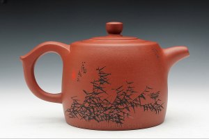 华健,男,2012年研高,省大师,师承国大师顾绍培,宜兴市非物质文化遗产项目代表性传承人。1964年5月生于陶都,1982年进宜兴紫砂厂,师承中国工艺美术大师顾绍培、研高刘建平,从事紫砂工艺创新制作。善制各类紫砂器皿,尤擅长方器造型的设计制作,紫砂全手工制作技艺功底不凡,属同辈艺人佼佼者。此款作品由华健老师采用原矿紫泥调砂全手打造,壶容量为500cc,方钮、方把、方嘴,嘴流输出强悍,粗细匀称,直挺有力;而四方压盖,方型桥钮,给人稳重、磊落、大气之感。壶体正面刻绘一位老者,壶体反面是由国工吴奇婉(寒