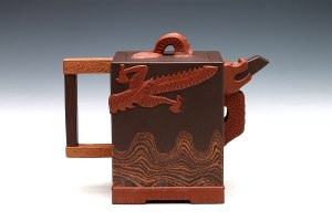 孔小明,男,1962年出生于制陶世家,2014年高工。1992年进厂,受到潘持平老师指点和吕尧臣老师作品风格影响,1990年与兄弟孔春华、姐姐孔新华、姐夫顾建军推出了“孔家壶”紫砂艺术品牌,紫砂绞泥技法,出神入化,目前宜兴可达此境界者,屈指可数。在方器的制作和创新上,“孔家壶”被行业是公认的实力派。孔小明老师的《六泉壶》采用了原矿紫泥制作而成,壶容量为420cc,六方井栏于传统器型之上加以改良制作,有方器的挺括刚劲,又不失柔和之美。壶身被六线条分成六面,直线线条转折处理细腻,钮、流、把皆以方器展现