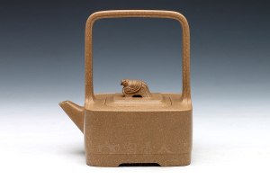 施小马,男,1954年生于江苏宜兴陶艺世家,2003年高工,实力派大师人物,紫砂四小龙之一。其父为施福生(紫砂工艺厂建厂元老之一,制壶名艺人),1971年进紫砂工艺厂随陈福渊学习。擅制方器,是一代方器高手,荣获“中国紫砂名人”称号。施小马老师这把《雀提》壶,采用了原矿段泥制作而成,壶容量为460cc,壶身以方为体,点、线、面处理得当,折角方中藏圆,温润细致。扁提梁线条优美、拿捏舒适。嵌盖设计,气密性好,的子是一只正在张嘴鸣叫的雀,直流方嘴,胥出有力,做工精致,刻画入微,且与主题相合。盖款『