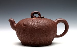 吴亚亦,1954年生于江苏宜兴,2011年研高,江苏省陶瓷艺术大师,江苏省陶瓷艺术名人、江苏省工艺美术名人。启蒙老师高级工艺美术师高丽君;师从中国工艺美术大师汪寅仙,在师傅的悉心指导下,技艺逐渐纯熟;作品常以雕塑手法与传统工艺相结合,制作精细、纹饰优雅,独具韵味。此壶采用了原矿朱泥制作而成,壶容量为260cc,此南瓜不仅外形酷似南瓜,更是集聚了南瓜的神韵,犹若瓜熟即将待落。壶钮、壶把嫉皆以南瓜藤为原型,形象逼真。壶嘴则若南瓜叶包裹而成,精巧别致,创意极新。壶把处一南瓜叶子胥出,苍老却不失神气。