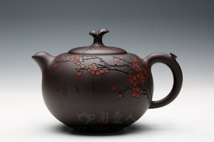 谢曼伦,女,2005年研高,江苏省工艺美术大师、中国陶瓷艺术、设计、教育终身成就奖获得者。1942年生,1958年进厂,师从老艺人朱可心,曾受到蒋蓉、顾景舟大师的辅导,作品深得大师真传,惜于2015年10月12日去世。壶身呈鸡心型,高足线,壶颈以子母线相吻合,攀梅花枝梗作嘴、把、钮。枝和节疤布置合理,伸展自然,疏影微斜,老干新枝,争奇斗妍;壶身堆塑梅花,花分正、侧、背、偏,或含苞、或怒放,把梅花“一树独先天下春”的顽强精神,刻画得淋漓尽致,颇有其师朱可心报春壶的神韵。