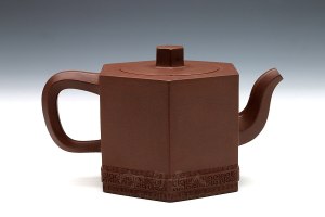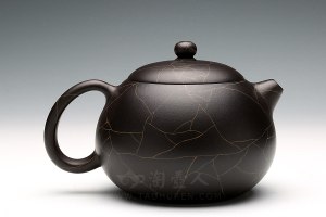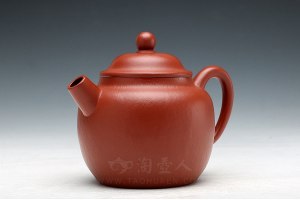 【高御带】壶,壶体饱满高挺,壶钮好似一座弯弯的拱桥,壶嘴外圆内方,壶把外方内圆,比例协调。压盖周正而合缝,各部衔接不见痕迹,浑然一体,流畅的线条强化了律动的视觉效果。可见周伯娟老师手法之娴熟,技艺之高超。