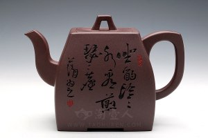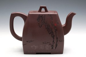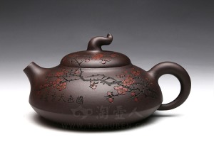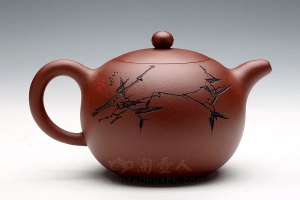 原矿紫泥拙味浓厚,360cc壶体素雅端庄,壶腹棱线分上下,直流直拙但出水痛快,壶柄圆融线条流畅,盖、身浑然一体,壶钮呈流线动感!更绝妙的是老师陶刻的红梅或盛放或含苞,暖意浓浓,“清香”扑鼻,真真“国色天香”!