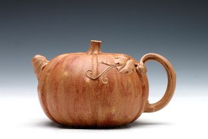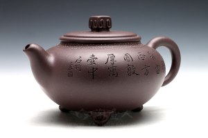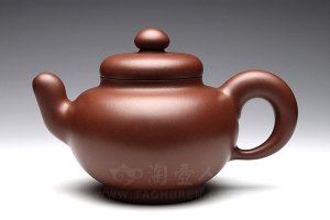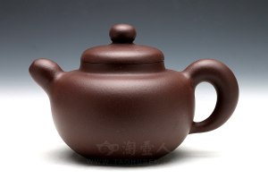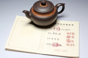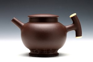 徐达明(1952—2016),2008年研高,江苏省工艺美术大师,中国陶瓷艺术大师。宜兴紫砂陶艺世家徐门第四代传人,中国工艺美术大师徐汉棠的长子。设计创新运用红木等材质与紫砂相结合,表现紫砂新语言。该壶选用原矿紫泥全手工制成,壶身鼓腹,饱满充沛;壶肩平稳过渡,高壶颈、压盖与壶口吻合严密,无钮设计更显敦厚朴质;底部圈足衬托出高挑的壶身,更显立体效果;直嘴斜出,出水流畅,壶把设计新颖,如同古代风箱的拉手,并镶以象牙装饰,将技艺发挥到精致!2004年全手工精品老壶,实为收藏的不二之选!