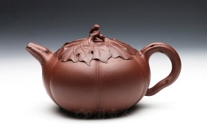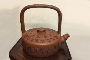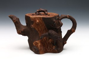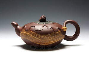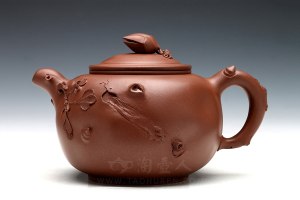 此器选用原矿紫泥制成,色泽古雅,敦厚内敛。壶身饱满呈矮圆柱状,嵌盖与壶身相谐,盖上塑一圈线条,与口盖形成优美的同心圆,盖上堆塑一段竹枝为钮,三节竹枝昂首斜出做壶把,提梁把自壶肩腾起,以四节竹爿相连,与壶体形成优美的虚空间。