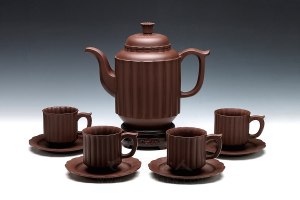 该茶具由一把壶、四只茶杯、四盏碟子组成,此壶用深紫砂泥制作,似檀木色,造型以十八瓣菊花构成,并变化成反面菊花瓣,筋纹深浅过渡自然,纹理清晰,口盖准缝通转。三弯嘴形优雅大方,扁平圈把上置飞扣。盖钮亦饰十八瓣造型,一丝不苟,气宇轩昂,雍容大度。整器纹理清晰、过渡自如,点、线、面严谨和谐。在紫砂界筋瓤货工艺要求极高,这“希菊茶具”以王氏经典筋纹手法制成,在王石畊老人手中展现出独特魅力,其收藏价值不言而喻。