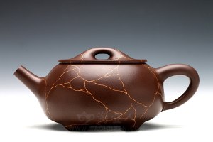 此款以景舟石瓢为原型加以演绎而成,壶腹宽和,阔大的壶盖直压壶口,桥形钮平稳过渡,直嘴出水顺畅,三角把较圆润,壶底钉足支撑壶体。较之子冶石瓢的骨肉亭匀,景舟石瓢更有肉感,更加雍容端庄。