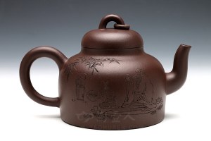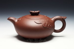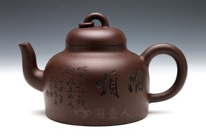王奋良,男,2013年高工,师从父亲王三大,紫砂七老之王寅春之孙,是王氏家族中第三代继承人。1964年生于宜兴,随父辈学艺,并经常受到伯父王石耕、叔父王小龙的悉心指导,作品手法全面,别具一格。《秤砣壶》原矿紫泥530cc,周伯其陶刻:“涤烦 何如玉川翁 清风煮秋水 岁次甲申年 春月阳羡 伯其书铭 ”涤烦子——故事出自唐•常伯熊《烹茶账中》。施肩吾有诗云:茶为涤烦子,酒为忘夏君。当驱愁破睡,涤烦忘忧的美酒香茶,注入诗盏词瓢之际,茶已非茶。