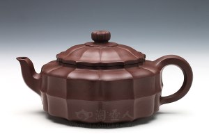 沈建强,1957年生于宜兴紫砂世家,2012年研高,省大师;作品以筋纹器见长,1991年开始对紫砂筋瓢壶的潜心研究,业界有“藏筋瓤,找建强”之美誉!合菱是众多筋纹器中的一款,壶钮与壶身均是由上下相间的筋纹花瓣咬合而成。壶盖是六瓣花瓣造型,筋纹沟壑深深,老师刻意表现出筋纹特有的凝重感,从而凸显出花瓣的肥硕。整个壶身是由12瓣花瓣上下镶接而成,分布均匀。流和把起棱线装饰。整器将圆形合菱壶做成方器效果,更显出老师的匠心独运。此器造型新颖,沉静内敛,将菱花的轻盈与筋纹的凝重相结合,创造出独特的艺术