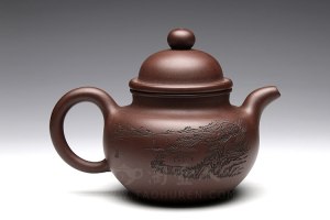 黄自英老师这款《掇球》壶制于甲申年(2004年)秋月,壶底印章旁刻“乐羽斋陶人製”,老师自制并题铭,壶体正面陶刻“厚德积福”,侧钤“阳羡陶人书”;反面刻绘山水画卷,笔触简洁,笔意辽阔,豪放大气。
