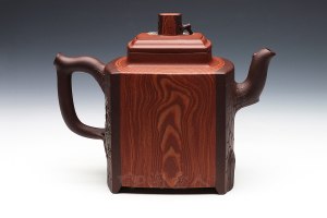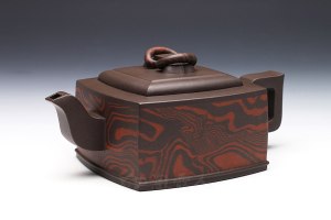 此壶壶身呈方体,棱角分明,线条清晰,切面干净整洁,手法利落,壶身绞泥工艺运用得炉火纯青,色彩明丽,呈现自然之美;方形壶盖向上凸起,盖上作套环钮,以绞泥装饰;嵌盖设计合理,流、把以四条棱线修饰,方圆相济,线条优美。壶底落款“孔小明制”。整器造型如古代所用的银箱,端方和谐,沉着之中自见清灵。