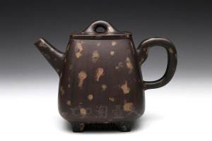 此款《四方石瓢》壶为徐维明老师一九九四年作品,壶体表面采用表层装饰工艺装饰,在原矿底槽清壶体上做出碎金花造型,古朴沉郁,简洁大气,极具收藏价值!经典高四方石瓢造型,壶身若方形深筒,壶底四足立地稳重,整器挺拔稳健,直流出水爽利,方平盖上桥钮贯通左右,气韵协调!