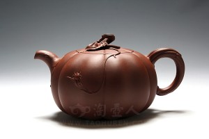 此款《得瓜》壶,张宏老师妙用了“种瓜得瓜种豆得豆”的谚语,整壶极具生活情趣,张宏老师不愧为实力陶艺家、当代紫砂艺术家!原矿底槽清制成的620cc大品壶,气韵充沛。壶体饱满圆融,筋纹浅浅勾勒出丰盈的弧度,线条流畅。嵌盖上壶钮为一根老藤,贴塑一片凋零的枯叶,叶茎连接至壶身贴塑出嫩叶,小虫忙忙爬动,十分有趣!