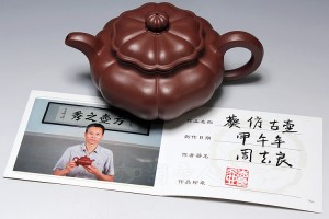 周志良老师是09年的国工,专制方器,人称“方壶之秀”,今年升高工的潜力人选,所制方器线面挺括,方圆并济,愈显中庸之道。这把壶以六菱葵瓣为图案,加上嘴、把、盖、钮也用筋纹起线,做工精细是老师一贯的风格,周志良老师以善制方器出名,筋纹器着实少见,使这款葵仿古更具收藏价值。