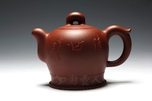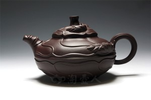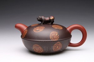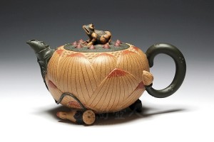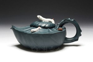 选用段泥制壶,壶体放佛荷花对月盛放,光华无限,清莲雅香;盖上敷墨绿泥拟青青的莲蓬,红泥做莲子在盖内生嫩俏皮,壶盖上蹲坐一只望天的青蛙作壶钮,蛙身青黄相接。莲子与蛙眼皆可动,顿觉生气逼人、惟妙惟肖。