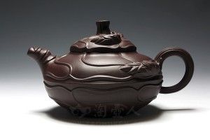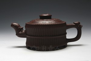 《龙头八卦一捆竹》壶,此壶式为明代邵大亨名壶,整壶以六十四根长竹段围成壶身,正合六十四卦之数;又以三十二根短竹段分成四组,每组八根,结以成足;壶盖浮雕八卦图,盖钮成太极之形,流把塑龙首,霸气昂扬;壶身束竹段腰带,壶底塑河图洛书。