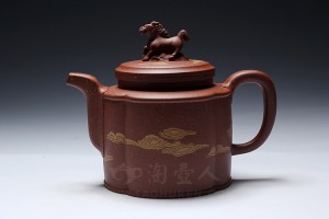周伯娟老师全手工制壶,古朴宽和,气韵上既顺应天道,又承载包容,“天行健”精美阐释!壶体筋纹修饰均分为四瓣,气韵饱满,420cc壶体高挺俊秀,各部比例协调,线条流畅,高颈而口盖子母线吻合紧密,盖中盖设计气密性佳,底线、肩线、盖线勾勒层次分明,奔腾的骏马作壶钮,加上壶身、壶盖采用工艺难度极大的绞泥云纹,天马行空,势不可挡!