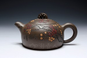 苏敏老师此款《亭亭玉立》壶,整器为半圆,流把造型敦厚,嵌盖上塑玉璧桥钮,端庄沉稳。400cc容量适中,原矿青灰泥的泥色与沈汉生老师刻绘《清韵》图中的红梅、腊梅相映衬,更显古朴质感。