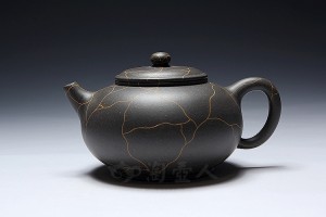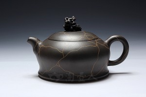 汤先武老师这把《抱朴》壶原矿青段制成,经多层次还原烧,呈色青灰棕色,大气而朴拙,精细的泥绘冰纹装饰更添加自然真趣,网球孔造型独特,极具个人特色。壶身造型简洁而古朴,腹底线条修饰,层次分明,流把胥出自然,线条衔接流畅。此壶特色在于以嶙峋的奇石做壶钮,令人想起园林中精致的景色,更有石头本身的朴拙之感,故以“抱朴”为名。